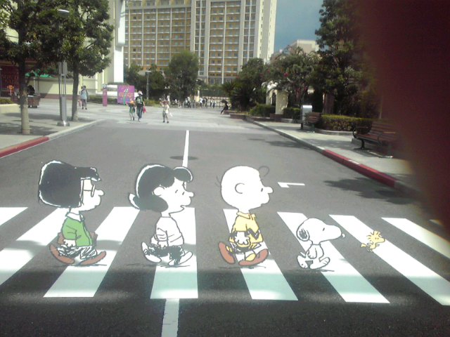 この偉大な某音楽グループリスペクトなトリックアート!なんかほんと歩いてるように見えるけど、実際は地面に描かれている状態の絵!目で見てると、全然こう見えないのに、写真に撮るとちゃんと歩いてるように見えてびっくりした!
