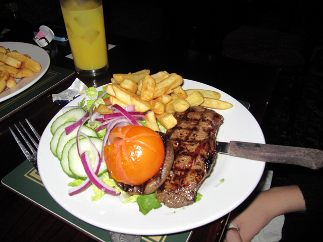 ステーキ!うん、一緒に映ってる腕が多少細い腕にしてもこの大きさ。っていうか肉以外。いや肉も大きいんだけど!(笑)