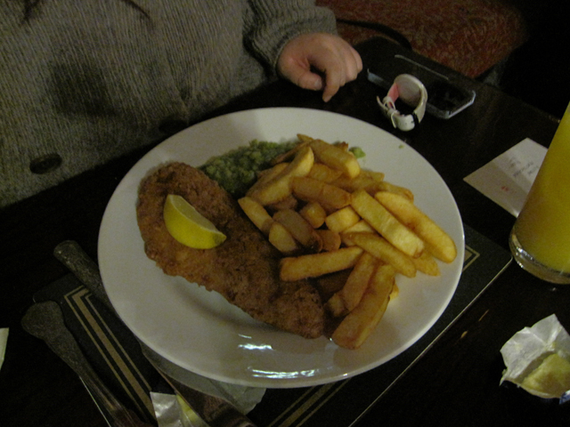 フィッシュ&チップス!・・・うん、大きさ・・・そしてポテト・・・。ポテトの横にはそらまめ?えだまめ?をクリーム状にしたもの。これおいしい。