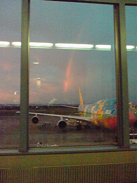 ・搭乗案内待ちの間に、赤い空に虹。おおお・・・!